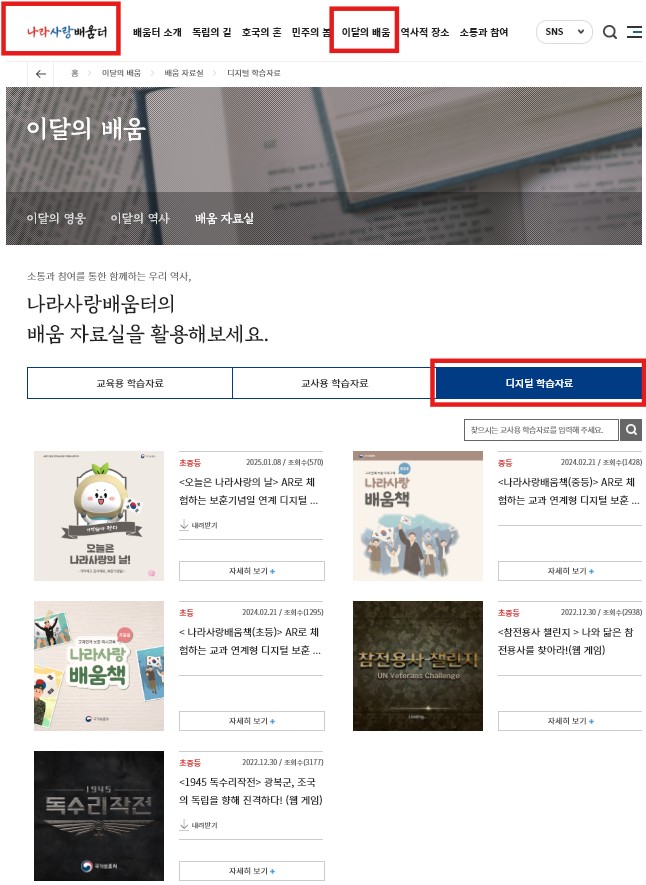 - 사이트 트리: 대메뉴 [이달의 배움터] ▶ [배움자료실] ▶ [디지털 학습 자료]